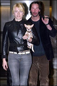 I know I know ... ![]() HOLLYWOOD hunk KEANU REEVES clearly has a weakness for the pale, delicate types. And you have to admit girlfriend AMANDA DE CADENET is not bad either. Keanu, Amanda and their mystery companion — an excuse for a dog that looked more like a shaved blond rat — were snapped after flying in to Los Angeles. And Amanda wasn’t letting go of the pointy-eared beast as they strolled off the plane from New York. Matrix star Keanu has had an on-off relationship with former wild child Amanda for years. Perhaps it’s time she let that freaky four-legged friend of hers off the leash and collared pedigree chum Keanu instead. After all, she wouldn’t want him to stray.